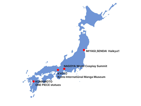 One example is Haikyu!! in Sendai. Because parts of the story are set in Miyagi Prefecture, Sendai has incorporated the series into its official tourism promotion. Characters have been appointed as tourism ambassadors. Monuments and themed manhole covers have been installed at designated locations. The city distributes maps that guide visitors through related sites.