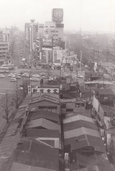 The local tram line, a nostalgic sight for those who knew the Shinjuku of the earlier part of the 20th century, shut down in 1970. The green line that runs from Yasukuni Avenue beside Golden Gai is a remnant of the tram line’s once-busy track. But another now-familiar Shinjuku sight was coming into being in the 1970s; the bright, advertisement-strewn exteriors of the multi-tenant Yasukuni Avenue midrises. These had originally been low-rise single-business eateries and offices along a recently widened avenue fronting the newly named Kabukicho district. In the early 70s, developers swooped up these plots and replaced the low-rises with a row of much taller, 8-10 floor buildings. While relatively high, these buildings occupied the same small plots as their predecessors, giving them their iconic, thin-and-tall look. [14]