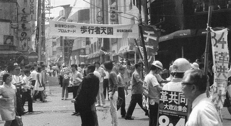 Shinjuku was now the core of modern, economically vital Japanese capitalism. In the 1970s, this was occurring under the watchful eye of Tokyo’s smiling governor, the self-declarative “Utopian Marxist” Minobe Ryokichi. In 1971, Shinjuku instituted one of his pet policies, a “pedestrian heaven” pedestrianized street. The car-less free-for-all still occurs ever sunday on Shinjuku’s own scramble intersection, a smaller version of the famed Shibuya Scramble right next to the Shinjuku East Exit that opened in 1971.