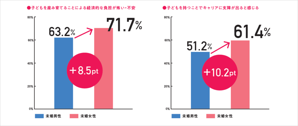 Digging into why, Rohto found that women more than men feared two things. The first was the economic burden that having kids entailed. Women feared this more than men, 71.7% to 63.2%.
