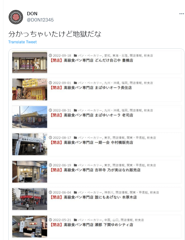 One Twitter user visualized this well in a recent tweet that went viral. “I get it, but this is hell,” user @DON12345 griped, and posted a picture of a number of high-end shokupan bread store listings from around the country. All of them were listed as “closed”[6].
