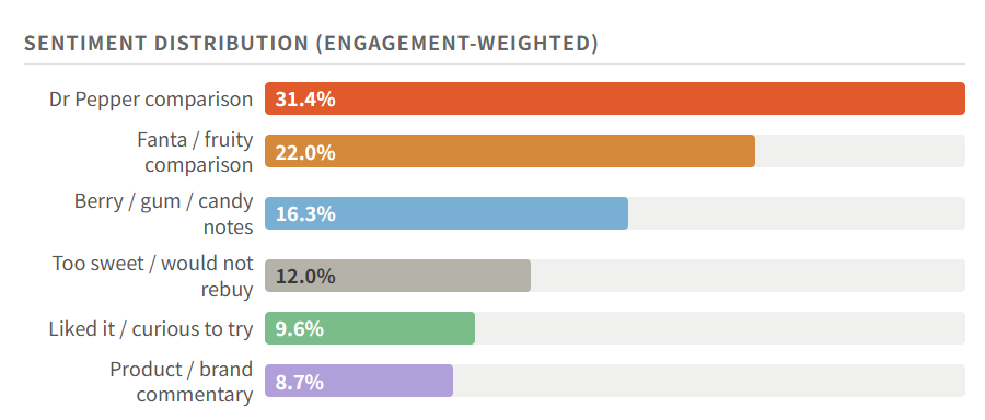 We analyzed 258 of the responses on that thread. Commenters start by comparing it to Dr Pepper. People also commented on the grape flavor, and other flavors like guarana, Fanta, fruit punch, cherry, and gum.