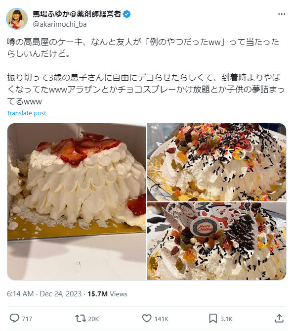 The controversy started as numerous users took to X to show pictures of the cakes that Takashimaya had delivered to their doors. Popular X account @takigare3, which tracks social media trends, posted a roundup of pictures showing cakes in a state of disarray. They labeled it “the Christmas from Hell” and included a link to the contact form for Takashimaya.